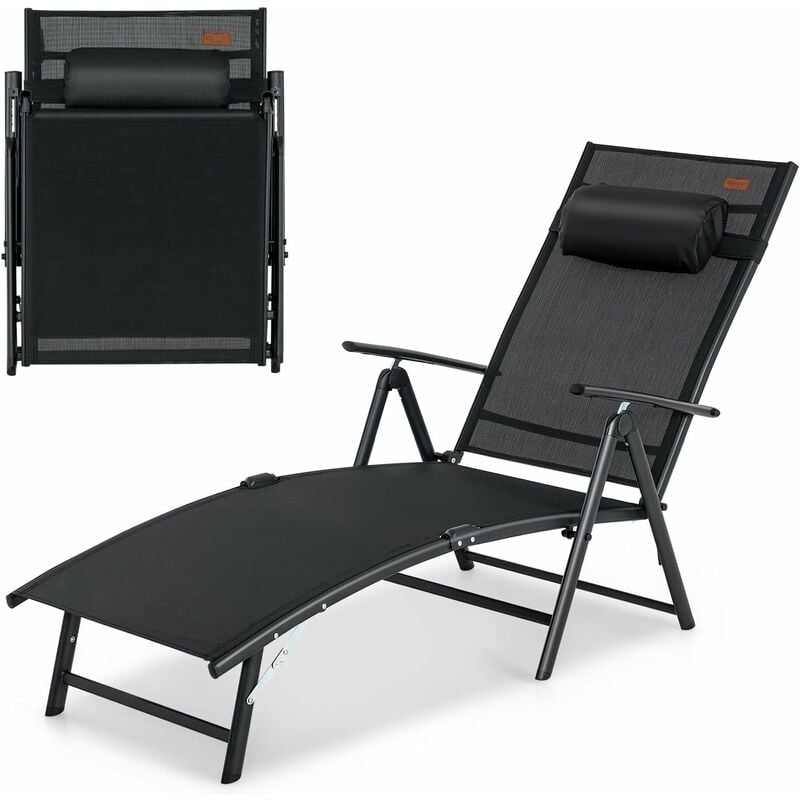 Costway chaise longue pliante, transat inclinable portable avec dossier réglable sur 7 positions, bain de soleil avec accoudoir, repose-tête, extérieur pour piscine, jardin, balcon (noir)