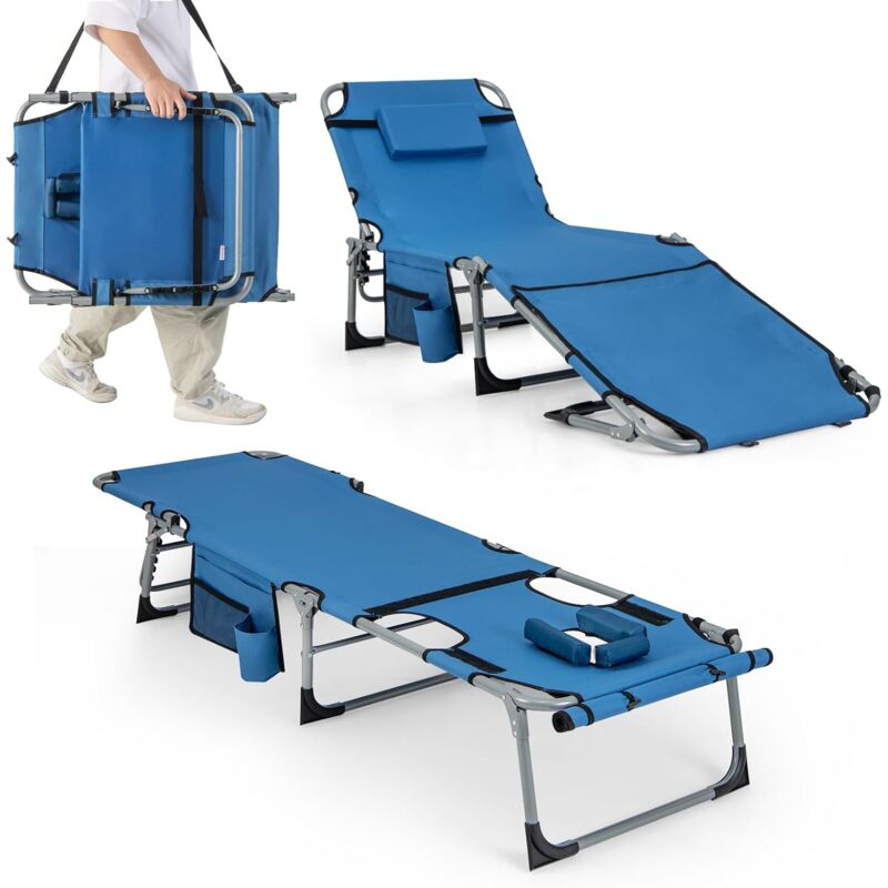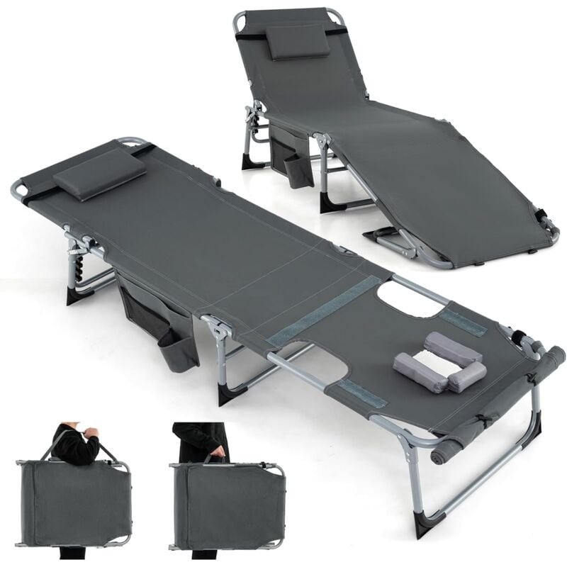 Costway - Bain de Soleil en Aluminium avec Dossier Réglable, Chaise Longue Pliante avec Oreiller Amovible et Trou pour Visage, Transat avec Poche
