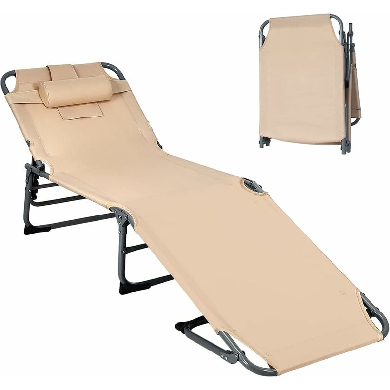 Goplus - Chaise Longue Extérieur Pliante, Transat Réglable à 5 Positions,Charge 150KG,avec Trou de Visage & Appui-tête Amovible, Beige