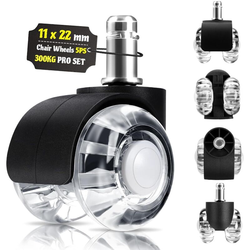 Jeu de 5 Roulettes de chaises de bureau 11 mm x 22 mm - Roulettes pour sols durs jusqu'à 175 kg - Roulettes pour chaises pivotantes sans rayures
