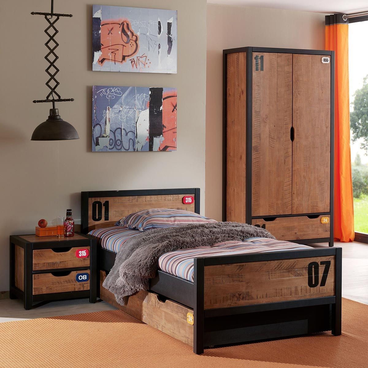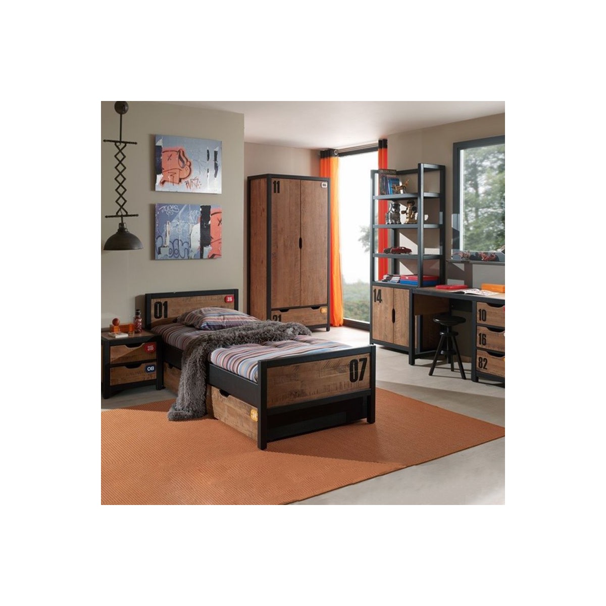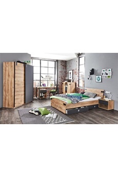 Chambre complète enfant ado collection DENVER. Armoire Lit bibliothèque chevet et étagère 200 Marron