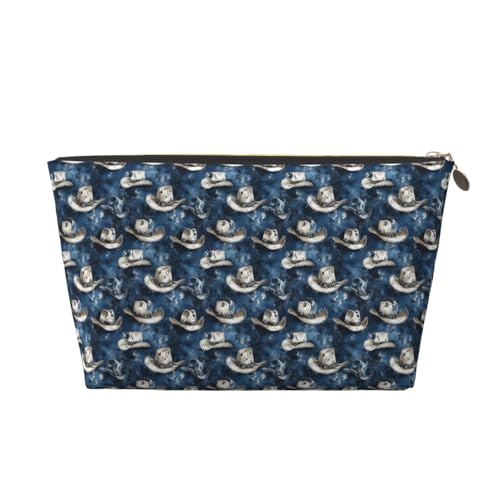 Nevjipu Petite trousse de maquillage de voyage en cuir – Trousse de toilette de voyage bleu marine et blanc avec imprimé chapeau de cowboy pour homme et femme, pochettes de rangement pour sac à main