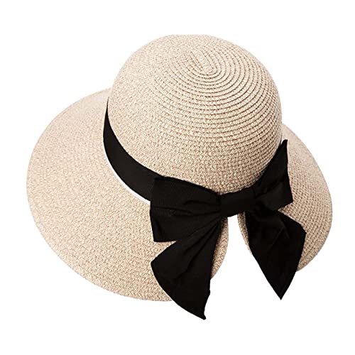 GizellMG Chapeau de Paille Pliable Panama de Plage Femme Capeline Solaire Chapeau Paille Solaire Anti UV Casquette élégant Noeud Satin 54-57cm Beige