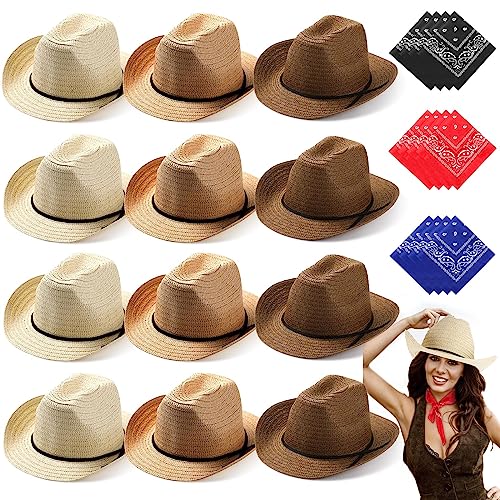 SATINIOR Lot de 12 chapeaux et bandanas de cowboy en paille – Chapeau de fête de cowboy avec bandana, Beige, kaki, marron, 55 cm / 22 inches