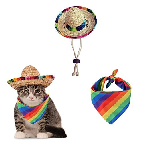 AWOCAN Chapeau de Paille pour Animal Domestique - Chapeau de Sombrero Mexicain - Écharpe Arc-en-Ciel - Décorations de fête pour Anniversaire - pour Petits Animaux domestiques, Chiots, Chats (A)