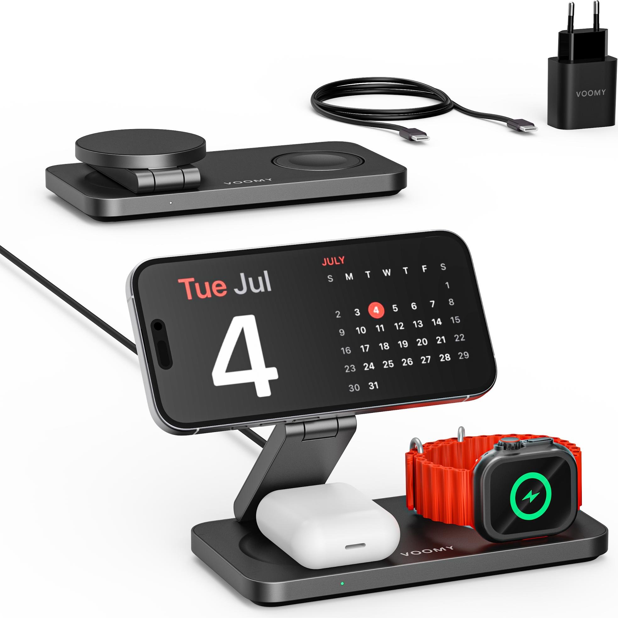 VOOMY Chargeur sans fil 3-en-1 - Chargeur sans fil 15W - Pliable - Pour iPhone, Apple Watch & AirPods - Compatible MagSafe - Noir