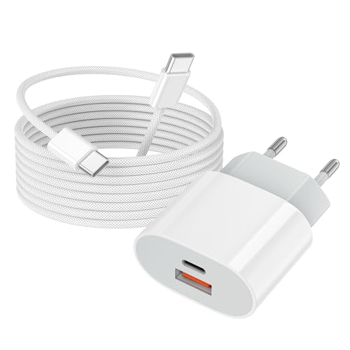 Chargeur USB C, 20W 2 Ports Prise USBC Rapide Secteur Alimentation, Multi Secteur PD+QC Type C Adaptateur avec 2M Cable für Apple iPhone 17/17 Pro/17 Air/17 Pro Max/15/16/16e/16 Plus/16 Pro Max