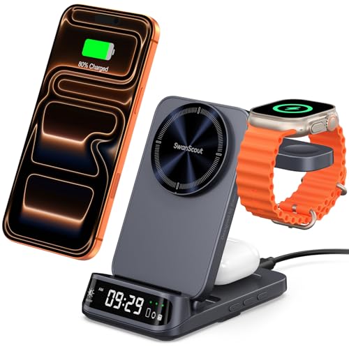 Station de Charge pour iPhone 17, Magnétique Chargeur sans Fil pour iPhone Air/17 Pro/17 Pro Max/16/15/14, Chargeur for Apple Watch Ultra 3/2/SE 3/2/11/10/9/8/7, Airpods, SwanScout 707M (No Adapter)