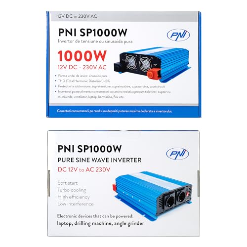 PNI SP1000W Convertisseur Transformateur Chargeur pour Voiture Onduleur à Onde sinusoïdale Pure, Onduleur 12 V DC à 230 V AC, 2 Prises Schuko