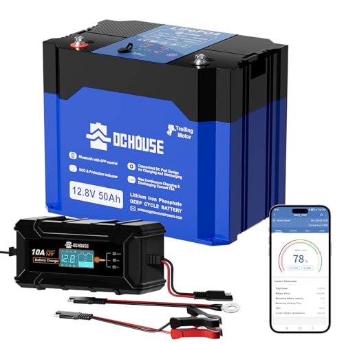 DCHOUSE Batterie LiFePO4 Bluetooth 12V 50Ah avec Chargeur 10A, Ports DC & Type-C, Cellules Lithium Grade A, Batterie Lithium 640Wh pour Moteur de Pêche, Camping-Car, Solaire, Bateau, Hors-Réseau