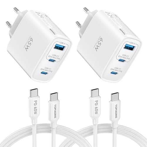 TOPADRE Chargeur 65 W USB C, Chargeur 2 pièces avec 2 câbles de Charge 60W (2m), Chargeur Rapide USB C Compatible avec MacBook Pro/Air, iPad Air/Pro, iPhone 17/16/15Pro Max et Galaxy 25+/24/23. Blanc