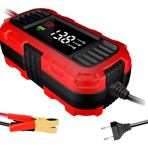 Peufcmi Chargeur de Maintien pour Batterie de Voiture 12 Volts,Maintaineur de Batterie Intelligent 12 V Portable - Accessoires Auto avec Affichage LCD et Compensation Thermique