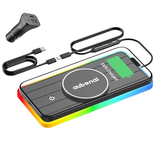 aubenai Chargeur de voiture magnétique sans fil 15 W RVB Tapis de charge antidérapant avec câble d'extension de 70 cm compatible avec chargeur Magsafe iPhone 16 15 14 13 12 (extension USB-C)