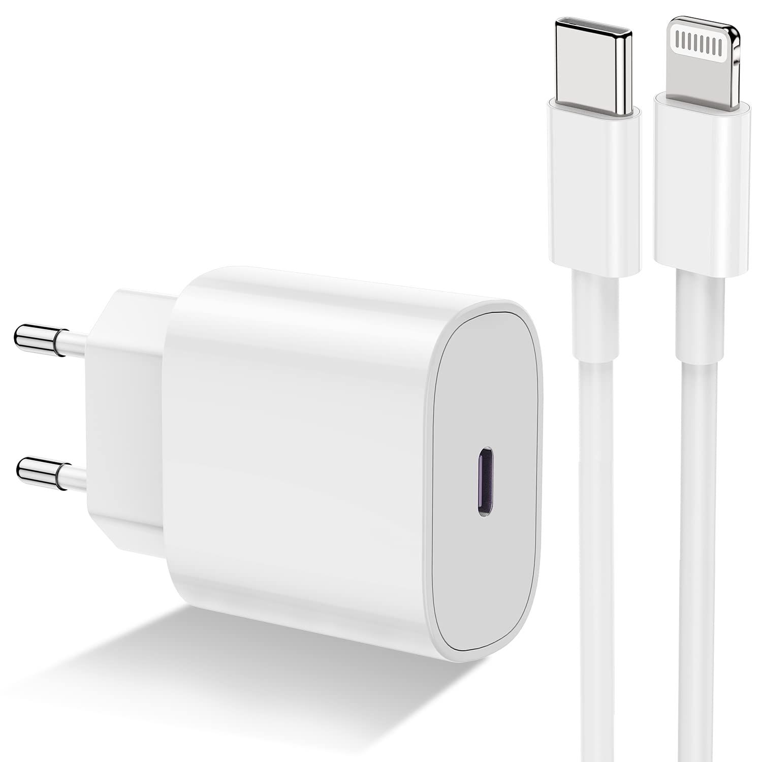 Chargeur Rapide pour iPhone 14 13 12 11 Pro Max Plus Mini XS XR X SE 8 7 6S 5S, 20W 2-Ports Chargeur iPhone Rapide avec 2M Câble Lightning, USB C Prise Secteur Type C Mural Alimentation Adaptateur