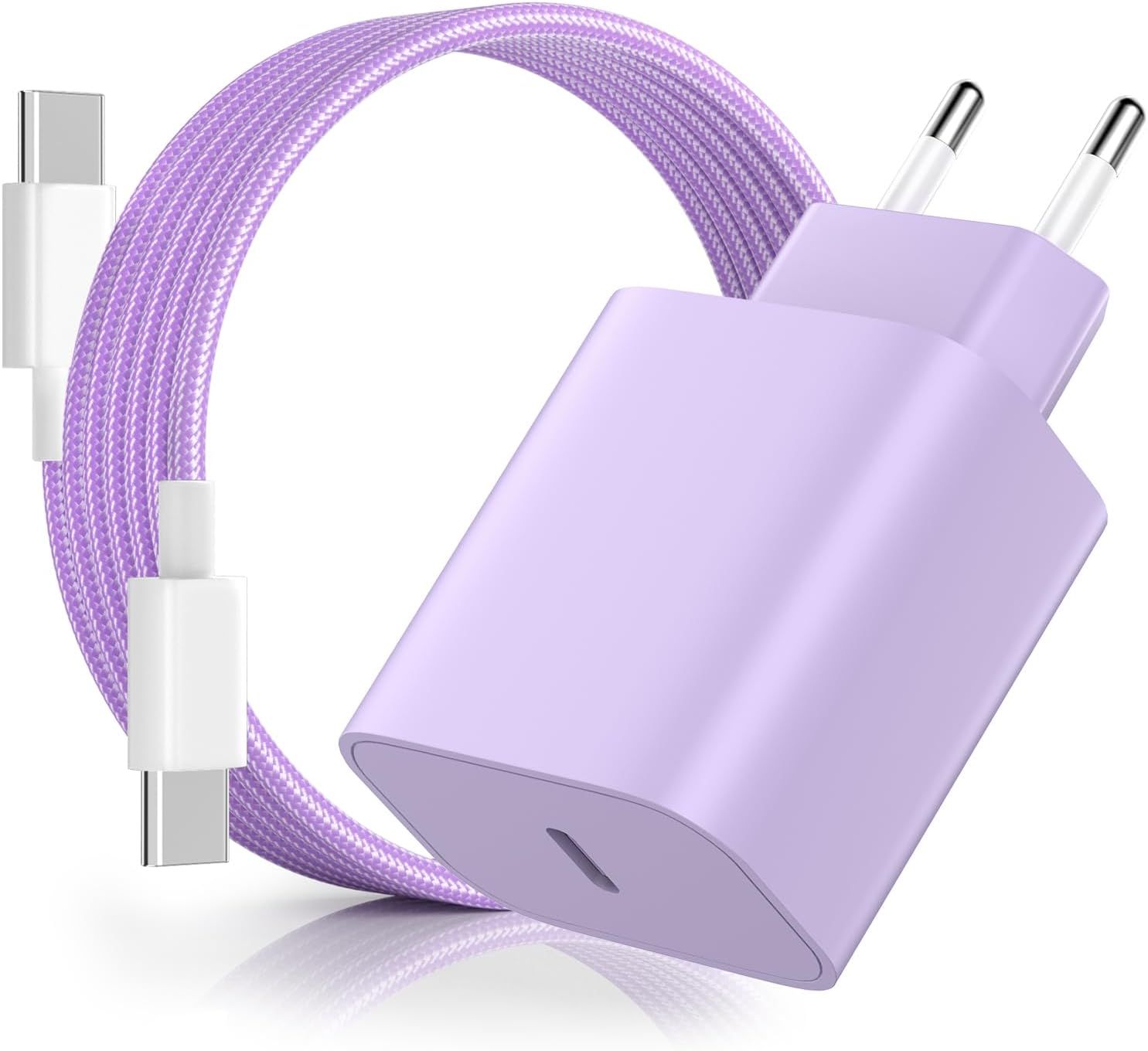 Chargeur pour iPhone Rapide, 20W PD3.0 Chargeur pour iPhone avec 2M Câble USB C, USB C Prise Charger Rapide pour Phone 16 Pro/16 Pro Max/16 Plus/15/15 Pro/15 Pro Max/15 Plus/Pad - Violet