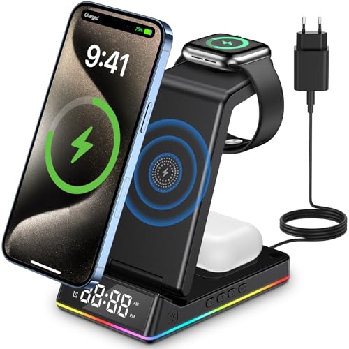 Station de Charge Apple 3 en 1 avec Horloge numérique, Chargeur Induction iphone Rapide 18W pour iPhone 15 14 13 12 Series, Chargeur sans Fil pour Air pods Pro 2, Wireless Charger pour Apple Watch 8