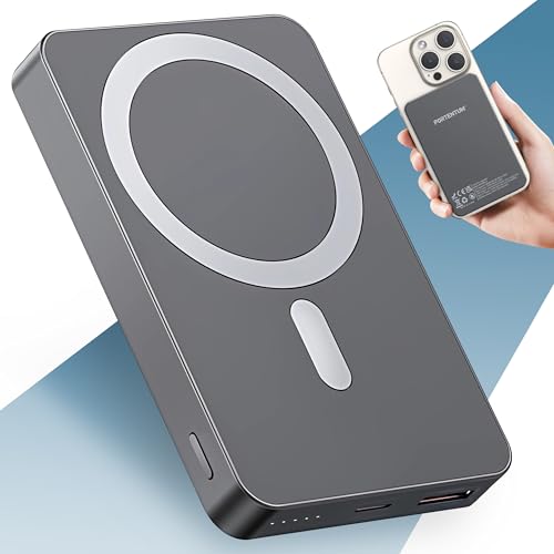 PORTENTUM Batterie Externe pour MagSafe Powerbank 10000 mAh Ultra-Fin 14 mm – Power Bank Charge Rapide 22,5 W PD et QC – Chargeur magnétique Qi 15 W – USB-C + USB-A pour iPhone Smartphones Tablets