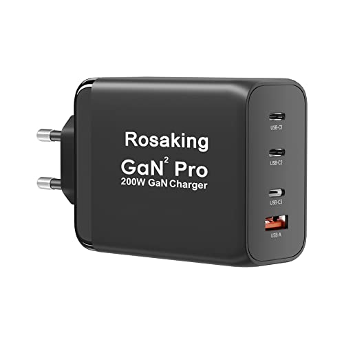 Rosaking Chargeur USB C 200W, Chargeur Rapide GaN III Tech, Chargeur Rapide USB C 4 Ports pour MacBook Air, Chargeur Compatible avec Samsung Galaxy Book