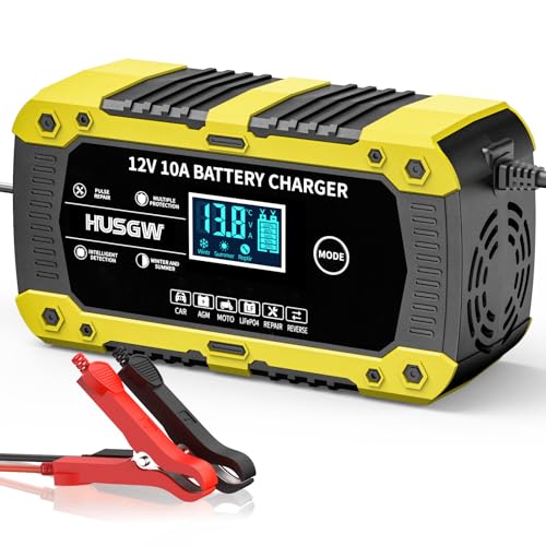 Husgw Chargeur de Batterie 12V10A, Chargeur Batterie Lithium Polyvalent, LiFePO4 Batterie Portable Voiture avec Réparation Automatisée, Maintien Charge pour Voiture/Moto/Tondeus/AGM/Gel/Wet/SLA