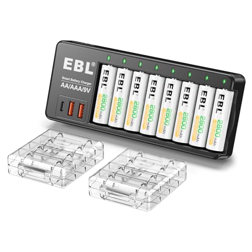 EBL Chargeur de Piles Rechargeables - pour AA/AAA/9V Piles, avec 8PCS AA Piles Rechargeables Haute Performance