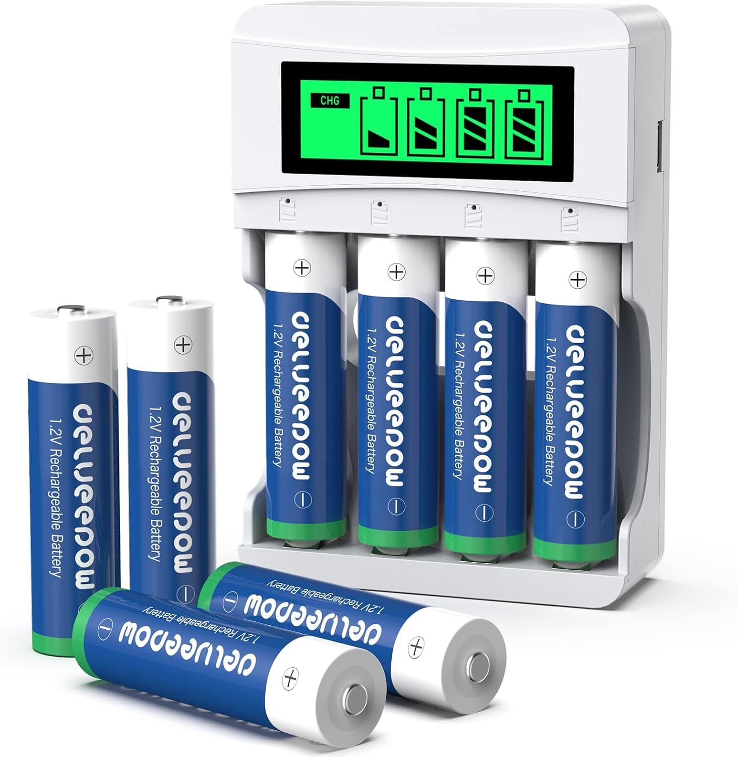 Delyeepow Piles Rechargeables AA avec Chargeur,1,2V Nimh 3300mAh Haute Capacité 8PCS, AA AAA Chargeur de Piles Rechargeables Individuel 4 Slots avec Indicateur LCD Intelligent