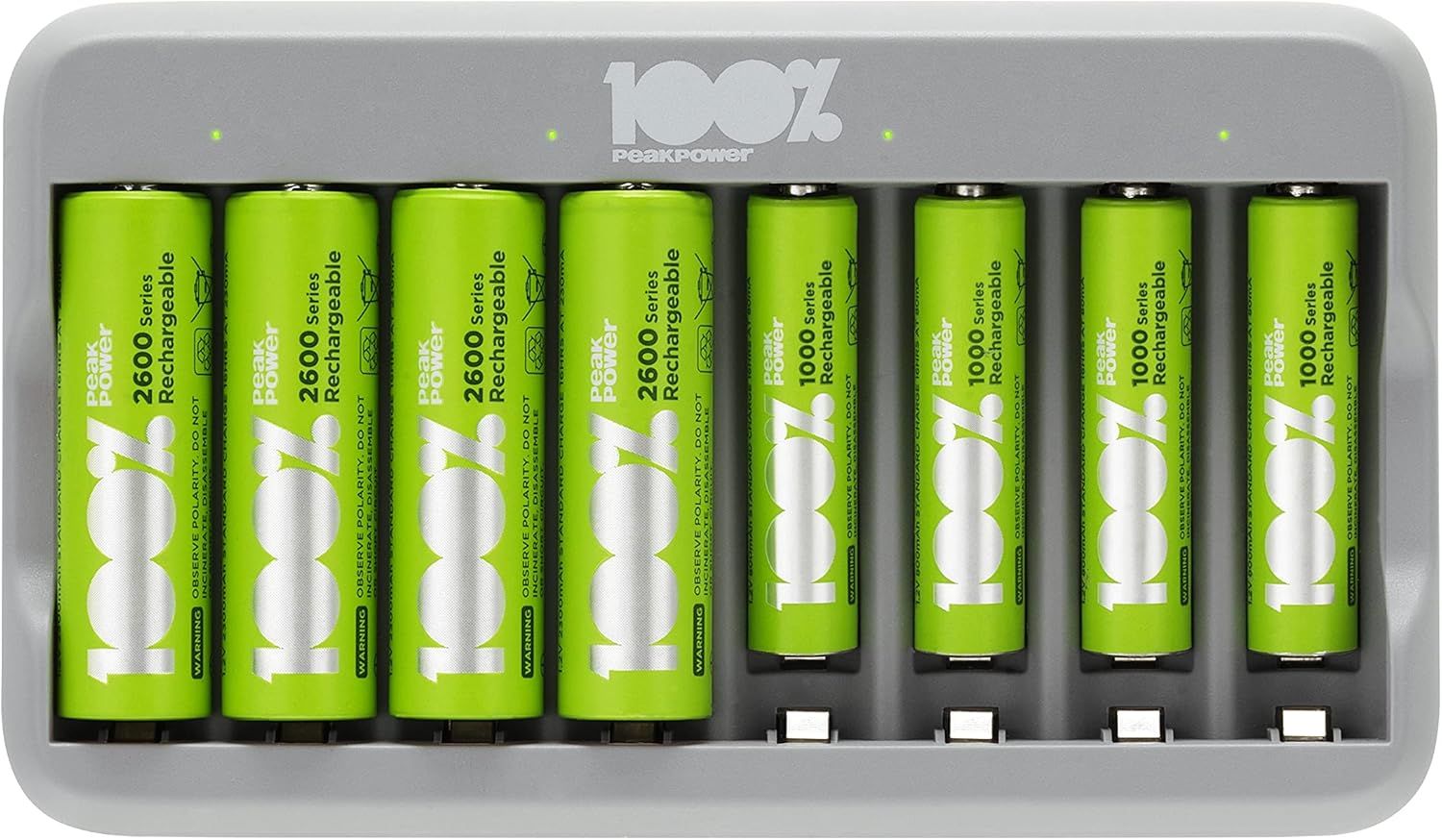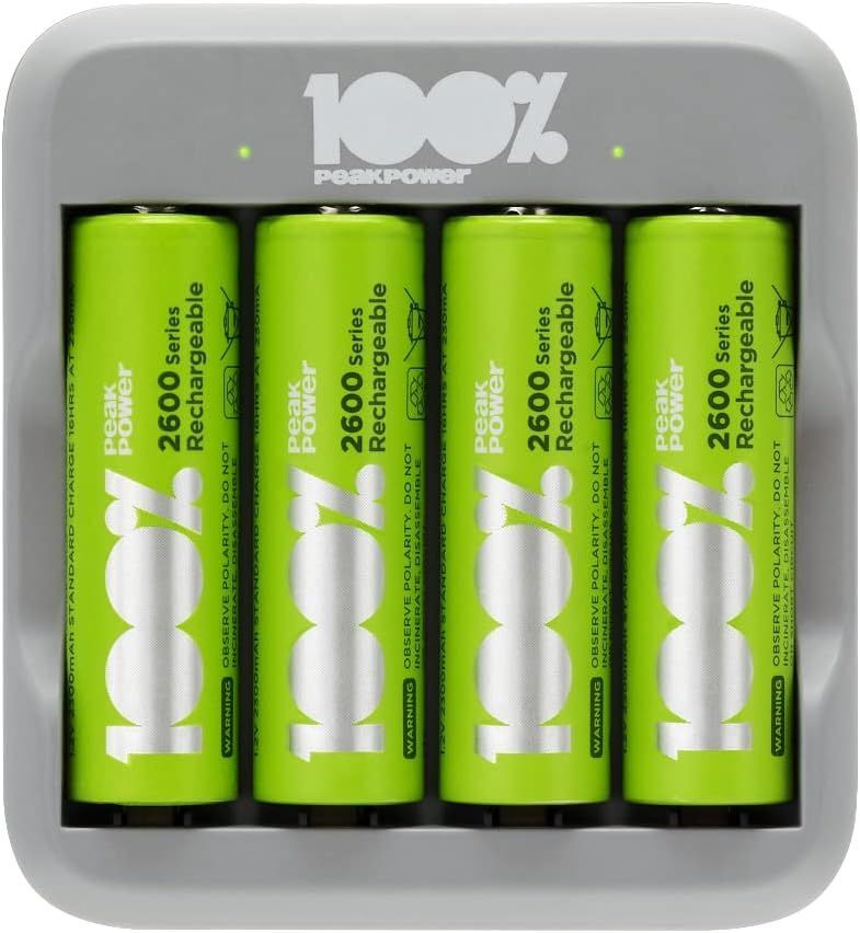 Chargeur Piles Rechargeables AA et AAA avec 4 Piles AA Minh Rechargeables incluses | 100% PEAKPOWER | Chargeur Rapide avec USB 4 emplacements + 4 Piles AA Minh pré-chargées - Haute capacité