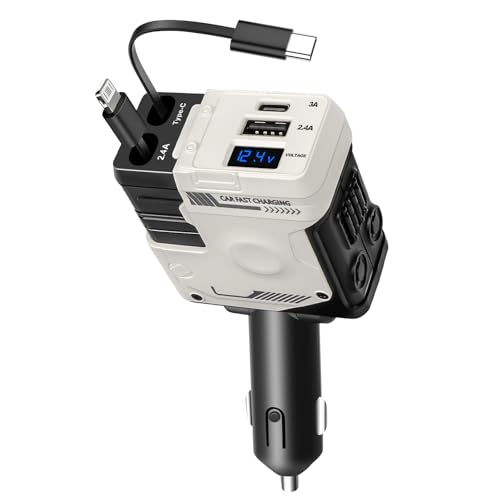 Chargeur Voiture,66W Chargeur de Voiture Retractable 4 en 1 Chargeur Voiture Rapide avec Câbles Rétractables et Affichage de La Tension,Compatible pour IP-Hone, Ipad, Android, Tablette