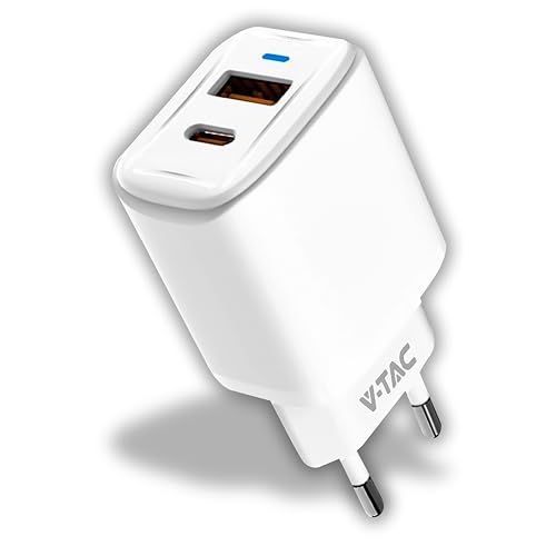 V-TAC Chargeur Rapide PD 20W USB-C pour iPhone et Samsung – Ultra Rapide pour Smartphones et Appareils – 2 Ports USB Type C et USB A pour iPhone 13/14 / 15/16 Pro/Max et Galaxy S24 /S25