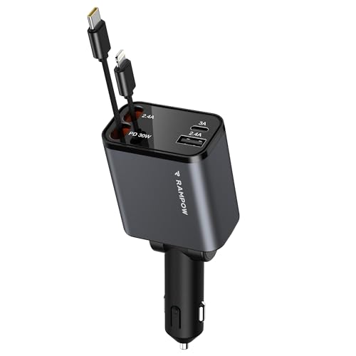 RAMPOW Allume Cigare USB C, 65W 4in1 Retractable Chargeur Voiture, avec câbles USB C et câble Lightning rétractables, Chargeur Allume Cigare pour iPhone 16/15, Samsung S24/23/22, iPad - Blau-Noir