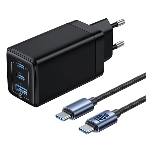 NOHON 65W GaN Chargeur USB-C Rapide: PD 3.0 Ultra Charger Con 140W USB C câble Ricarica Rapido Cavo 1.2M | 3 Ports Compatible avec iPhone 17/16/15/14/13, MacBook, iPad, Samsung Galaxy S (Noir)