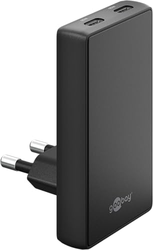 goobay 65W Chargeur Plat GaN USB C, Chargeur Rapide à Double Port (2X USB-C) - Design Plat à 90°, Ultra-Mince et Peu encombrant, pour Apple, Samsung, Huawei, Ainsi Que pour tablettes, etc. Noir