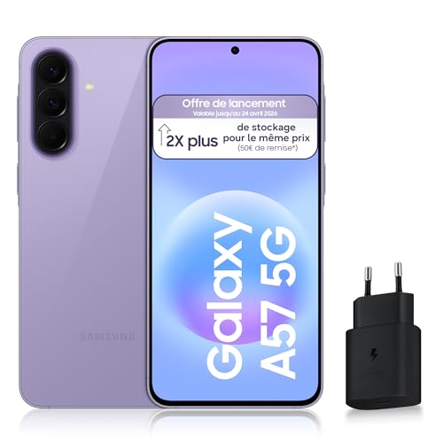 Samsung Galaxy A57 5G, Smartphone Android, 128 Go, Chargeur Secteur Rapide 25W Inclus, Smartphone déverrouillé, Lavande, Version FR