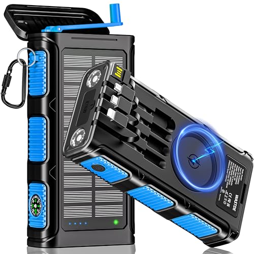 WASTDE Batterie Externe Solaire sans Fil 26800 mAh avec Manivelle et 4 Câbles, Chargeur Solaire USB-C Charge Rapide 7 Sorties et 4 Entrées pour Téléphone, Batterie Externe étanche pour Camping