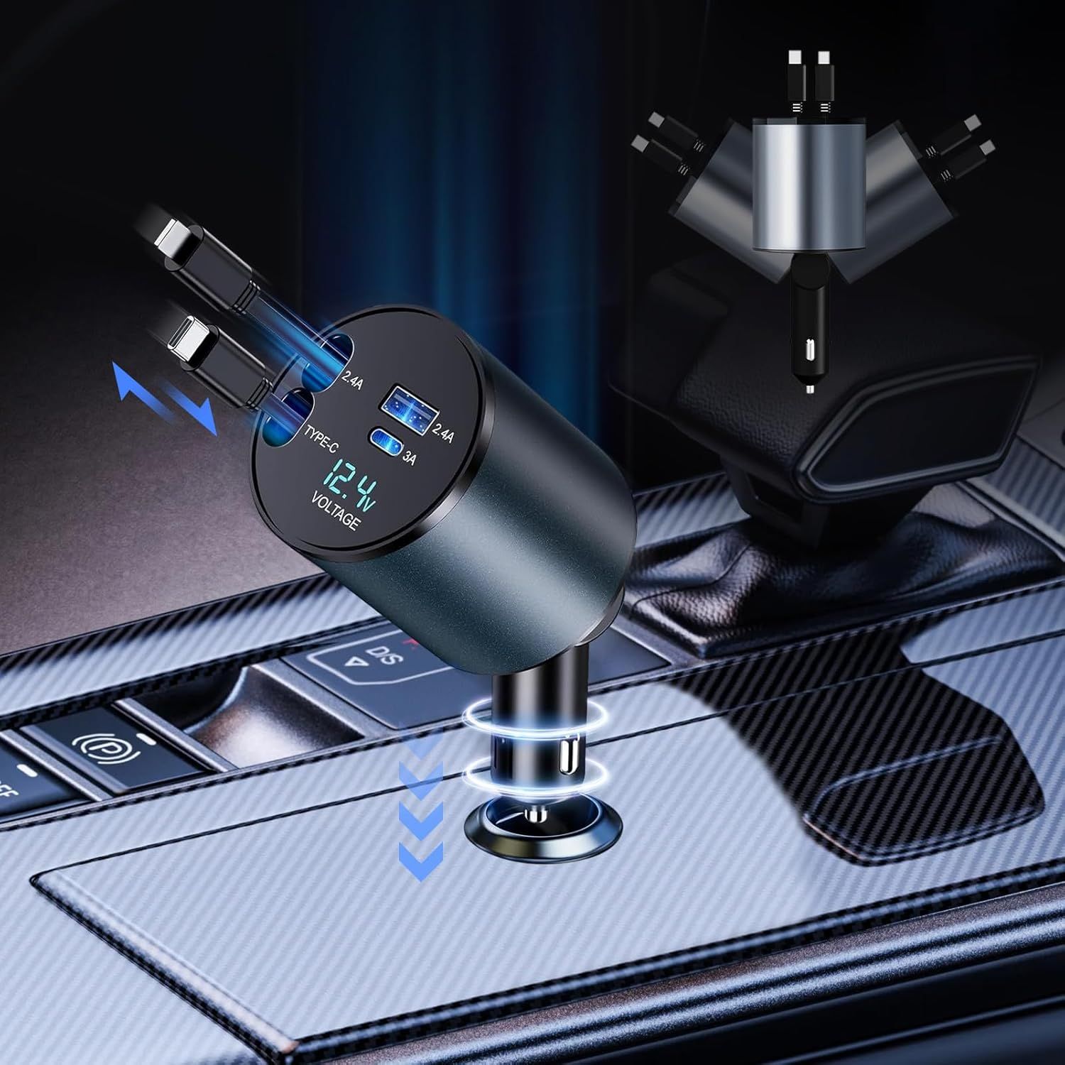 Chargeur Allume Cigare Usb C Rapide Rétractable 120W Double Câbles 4 En1,Chargeurs De Téléphones Portables Usb Et Type-C 2.4A/3A,Pour Iphone/Ipad,Galaxy/Google/Huawei/Mtk/Xiaomi,12-24 V