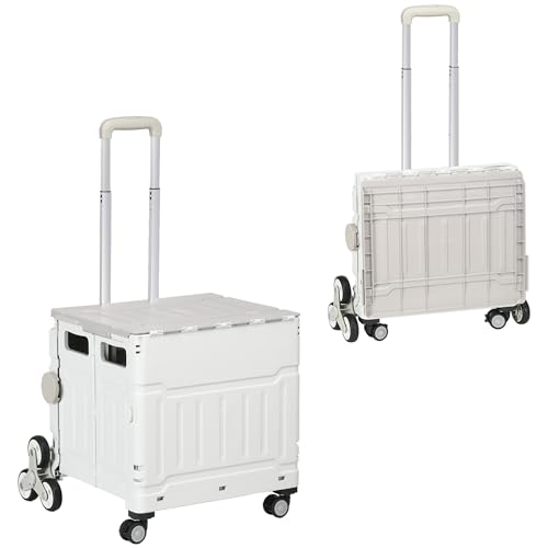 HOMCOM Chariot de Courses Pliable Caddie de Courses Portable avec poignée télescopique réglable et Couvercle, Chariot Montant escalier à roulettes Charge Max. 80 kg, Blanc