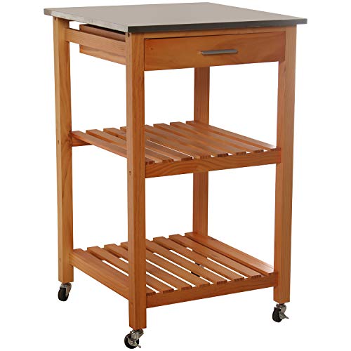 DRW Chariot de Cuisine avec 1 tiroir et 2 étagères en pin et Couvercle en Acier Inoxydable Couleur Bois 54 x 54 x 86 cm