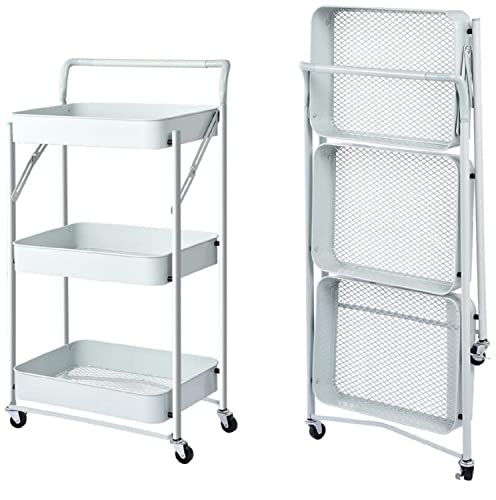 Chariot de Cuisine Pliable Multifonction avec poignée 3 étagères, paniers 4 roulettes et Frein intégré en métal, Chariot économise de l'espace, Blanc