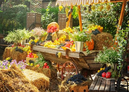 CORFOTO 1.5x1.2m Toile de Fond représentant Un Chariot de Fruits Frais de la Ferme Chariot Rustique en Bois et Motif de Fruits colorés Thème « marché campagnard » pour événements et photomatons