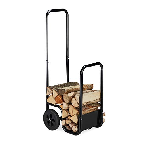 Relaxdays Chariot à bois, en acier, avec 2 roues, transport & stockage, jusqu’à 40 kg, panier à bûches, noir
