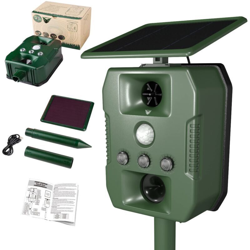 Repulsif Chat Exterieur Ultrason - Anti Chien Pigeons Souris Rats - Solaire USB Multifonctions LED Sonore - Pique Vibrations - Chasse Taupe - Repousse Rongeur - Appareil Puissant Efficace