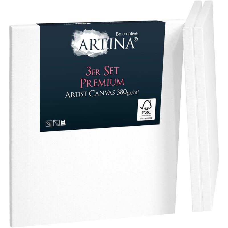 3D Toile Peinture sur Châssis Bois pour Toile Fait de 100% de Coton 380g/ m² - Toile Vierge 3 Fois Peinte au préalable - Lot de 3 20cm, 30cm - Artina