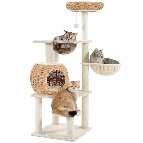 Yaheetech Arbre à Chat en Rotin Tour pour Chat en Peluche avec Cachette Ronde Perchoir Paniers Griffoir en Sisal Jouet Design Moderne 137,5 cm de Haut Beige