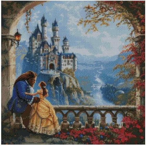 Kit de broderie au point de croix compté La Belle et la Bête devant le château, 14 fils en coton, 200 x 200 points, 36 x 36 cm, motif La Belle et la Bête