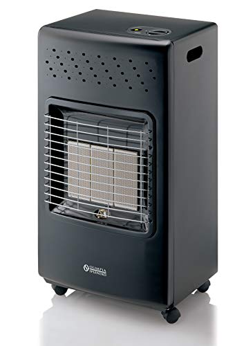 Chauffage à gaz d'intérieur, flamme bleue, design compact, couleur noire, idéal pour chauffer les espaces et une utilisation domestique.