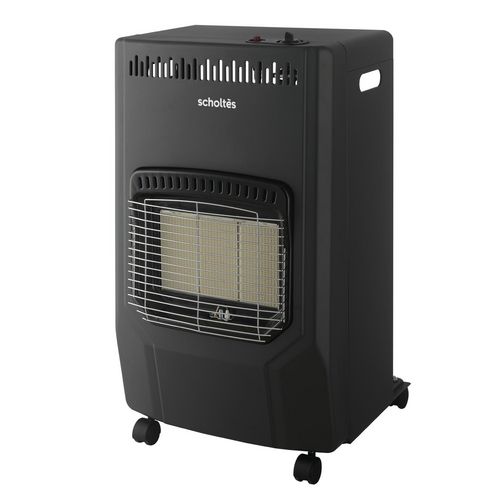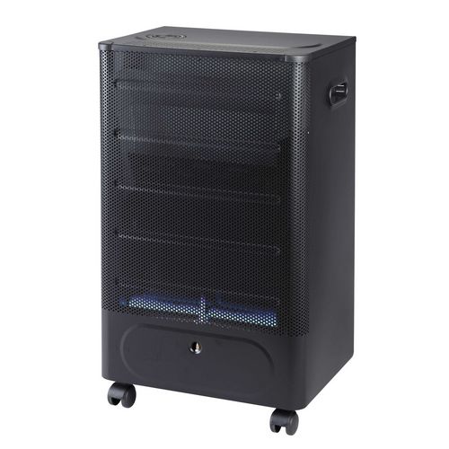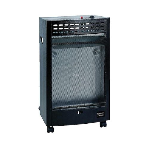 Chauffage à gaz d'intérieur, flamme bleue, design compact, couleur noire, idéal pour chauffer les espaces et une utilisation domestique.