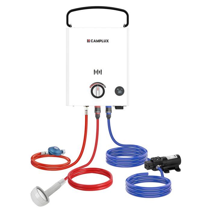 CAMPLUX First 5 Litres Chauffe-Eau à Gaz avec Pompe LPG 50mbar Poignée Réglable pour Douche Extérieure Camping F5 Pro-DE