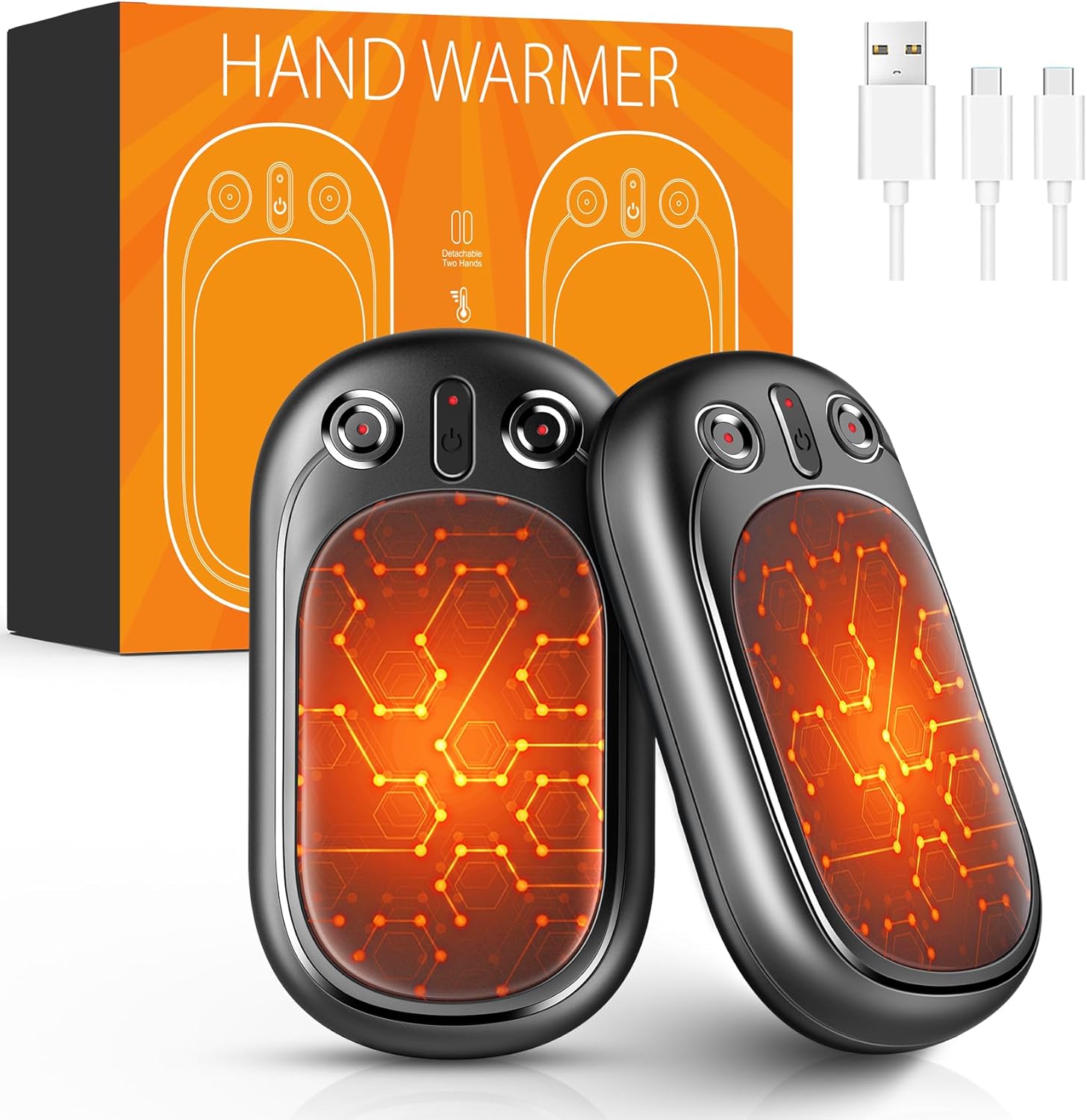 Chauffe-Mains Rechargeable 10000mAh, Réutilisable Électriques Portables USB Power Bank, Chauffe Mains Split-Magnétique 2 en 1, Batterie pour iPhone, Urgence, Chaufferette pour Hommes (Noir + Orange)