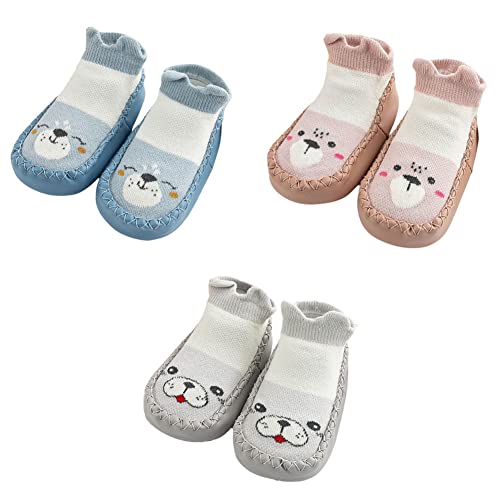 FedMois 3 Paires Chaussettes Pantoufle Antidérapantes Chaussons Bébé, Bleu, Beige et Gris, 2-2.5 ans