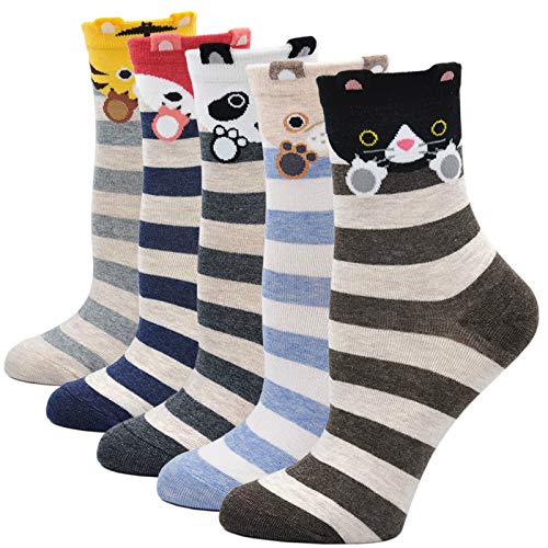 LOFIR Chaussettes Fantaisie Femme Coton Animaux Chat Chien, Chaussettes en Coton Doux et Mignon pour Fille Femme, Taille 35-41, 5 Paires