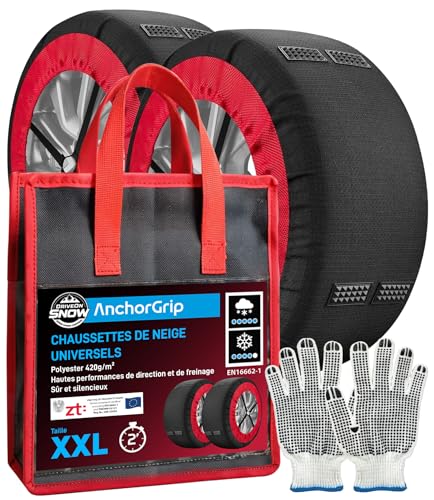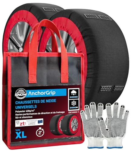 Chaussettes de Neige Textile Homologuées EN 16662-1 Taille XXL Chaussette Pneu Voiture - DriveonSnow AnchorGrip avec Crampons Antidérapage Montage Rapide 2 Minutes Haute Sécurité + Gants